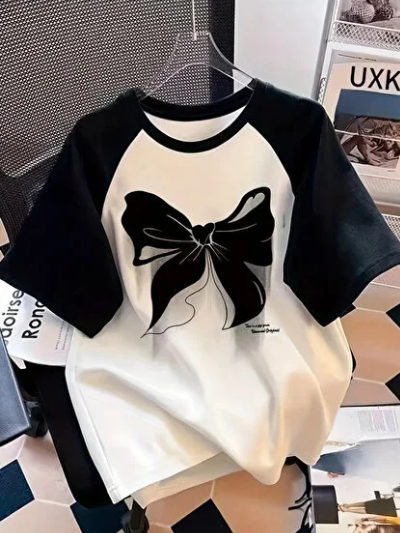 The image shows a casual short-sleeve T-shirt with black raglan sleeves and a white body. The front features a large, stylish black bow graphic at the center. The shirt is displayed on a hanger over a chair, with some magazines and other items around it, giving it a trendy and modern aesthetic.