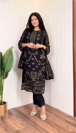 This stunning black kurta set radiates elegance and sophistication. The knee-length kurta features intricate golden thread embroidery in floral and paisley patterns, giving it a rich and festive look. The sheer chiffon sleeves add a touch of delicacy, while the matching dupatta enhances its graceful appeal. Paired with straight-fit black pants, this ensemble is perfect for festive gatherings, evening events, or traditional celebrations.