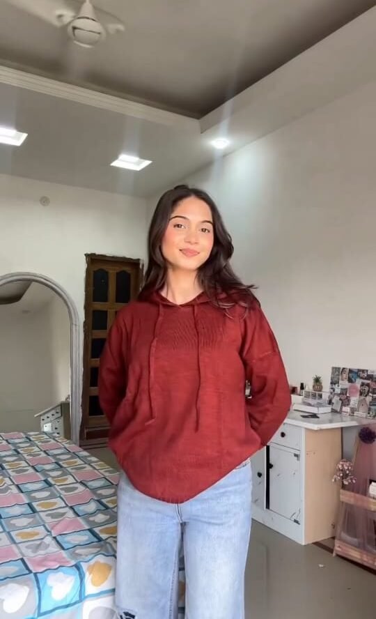 The image shows a woman standing comfortably in a bright, neatly arranged bedroom. She is wearing a soft maroon hoodie with drawstrings, paired with light blue jeans that give her outfit a relaxed and effortless feel. Her hands are tucked into the hoodie’s front pocket, adding to the cozy, laid-back vibe. The room features a colorful patterned bedspread, a white dresser with various items arranged on top, and soft natural lighting that creates a warm, inviting atmosphere.