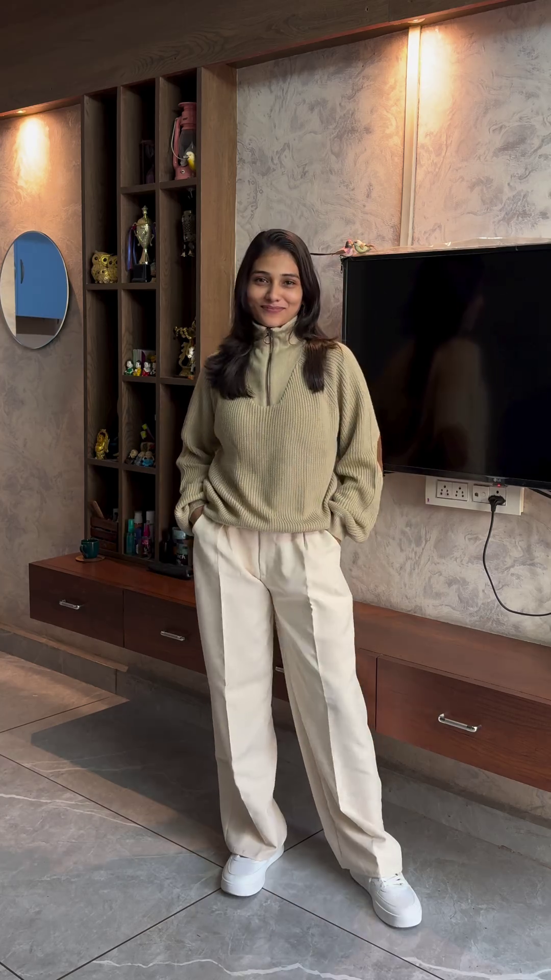 Designed with a classic round neckline and long sleeves, this knit sweater pairs seamlessly with a wide range of bottoms. Style it with tailored cream trousers for a smart-casual office look, or wear it with denim jeans for an effortlessly chic everyday outfit. The neutral color palette allows for easy layering with coats, scarves, or boots, making it a perfect choice for transitional weather and winter months.