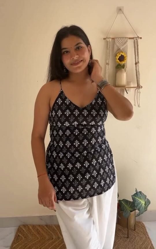 • Description: This stylish sleeveless top features a black base with an intricate white geometric pattern. The deep V-neck and spaghetti straps create a trendy look, paired with crisp white pants for a balanced, casual outfit. The setting includes a cozy indoor backdrop with a sunflower wall hanging and plant decor, adding a touch of warmth.