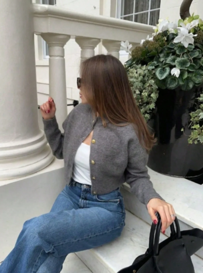 A woman is sitting on white steps in front of an elegant building with tall columns. She is dressed in relaxed, stylish attire—a gray button-up cardigan over a white top, paired with high-waisted blue jeans. She’s looking to the side, her long brown hair flowing naturally, while holding a black handbag beside her. Large planters with lush greenery and white flowers sit behind her, adding a soft, refined backdrop to the scene.