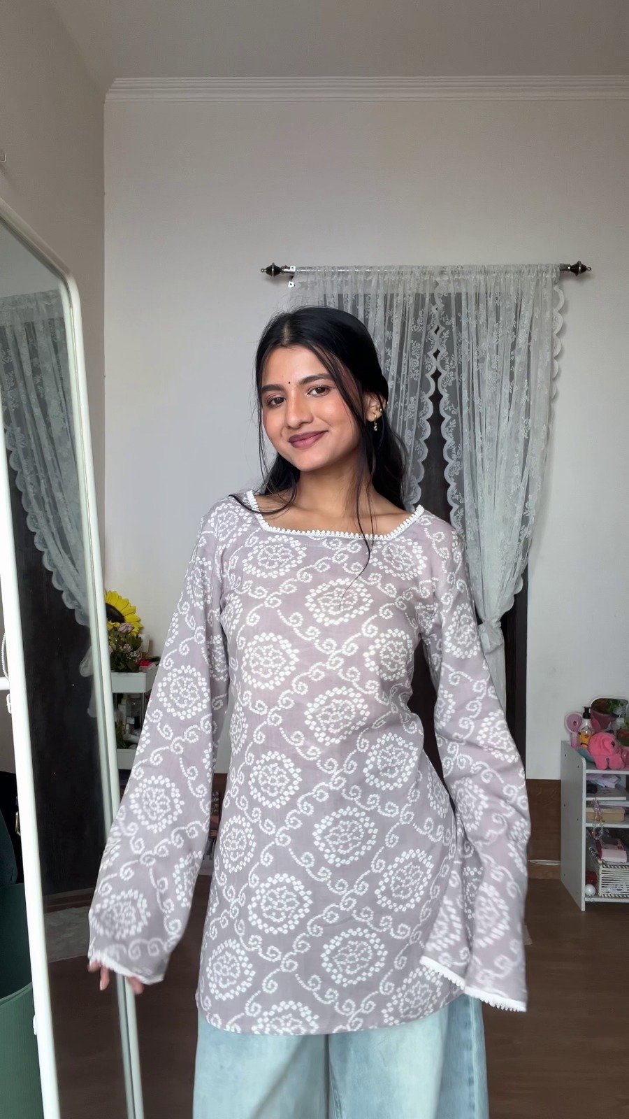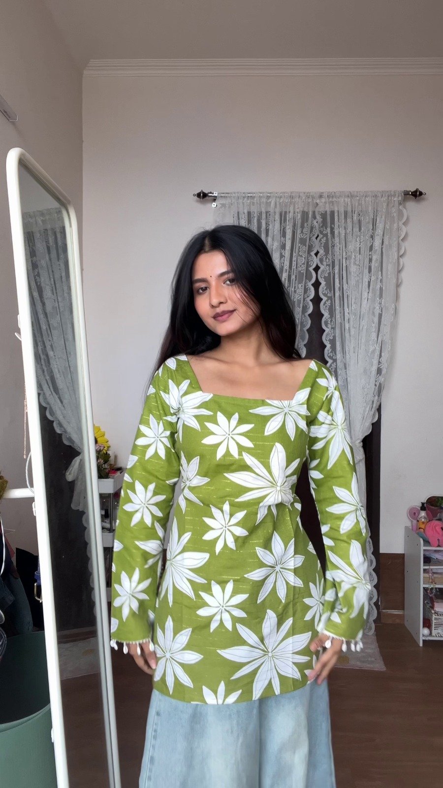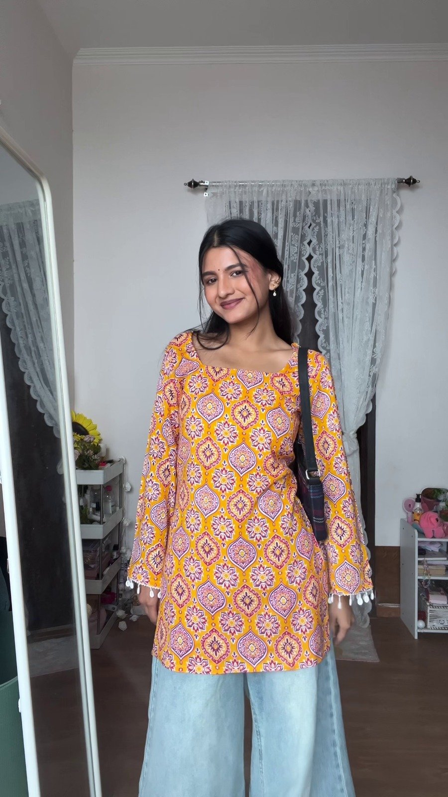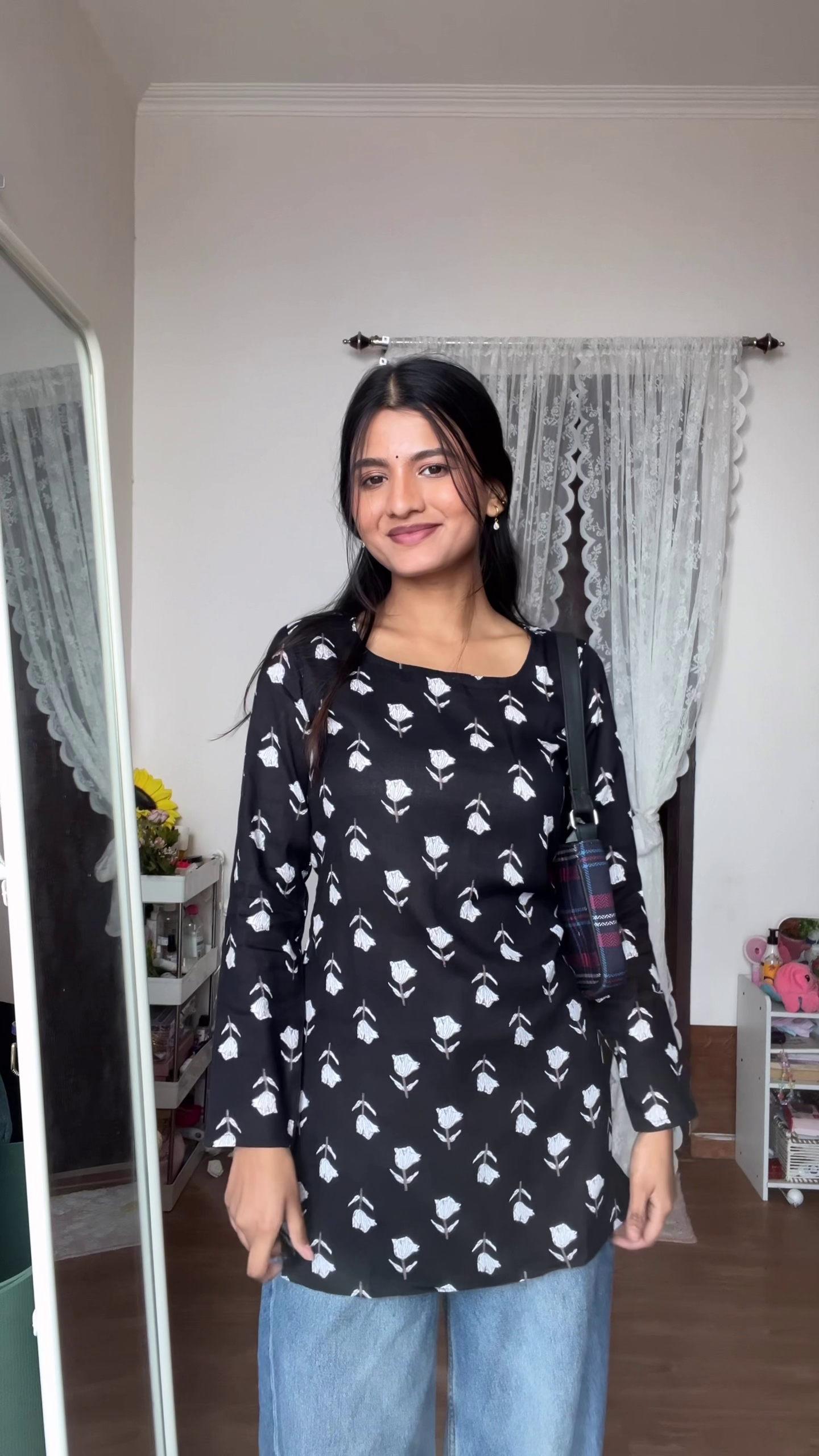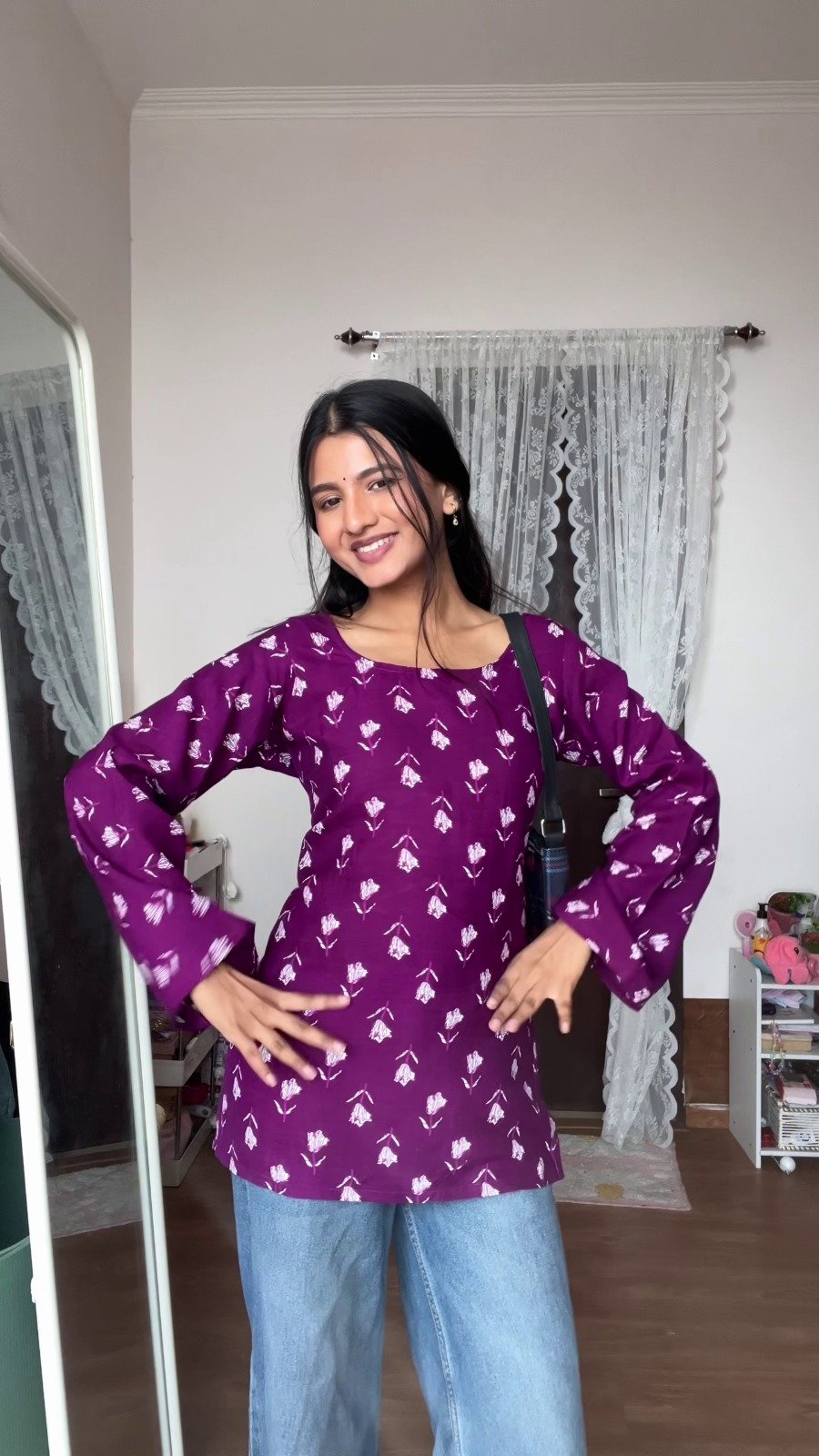 Simple accessories and natural makeup enhance the overall aesthetic without overpowering it. A small shoulder bag adds functionality and style, completing the look with a practical touch. This kurti is a wardrobe essential because it can be styled in many ways — with jeans for a fusion vibe, with palazzos for a more ethnic feel, or layered with a dupatta for dressier occasions. It’s a reliable go-to piece for effortless, repeatable styling.