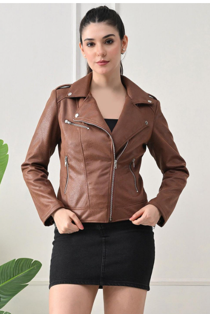 The image shows a woman wearing a timeless brown leather moto jacket with sleek silver zippers and structured lapels. The jacket has a fitted silhouette that enhances the polished, confident look. She pairs it with a simple black mini dress, creating a stylish contrast between the smooth leather texture and the soft fabric of the dress. Her hair is pulled back neatly, complementing the clean, modern aesthetic. The minimal indoor background with a touch of greenery keeps the focus on the bold, fashionable outfit.