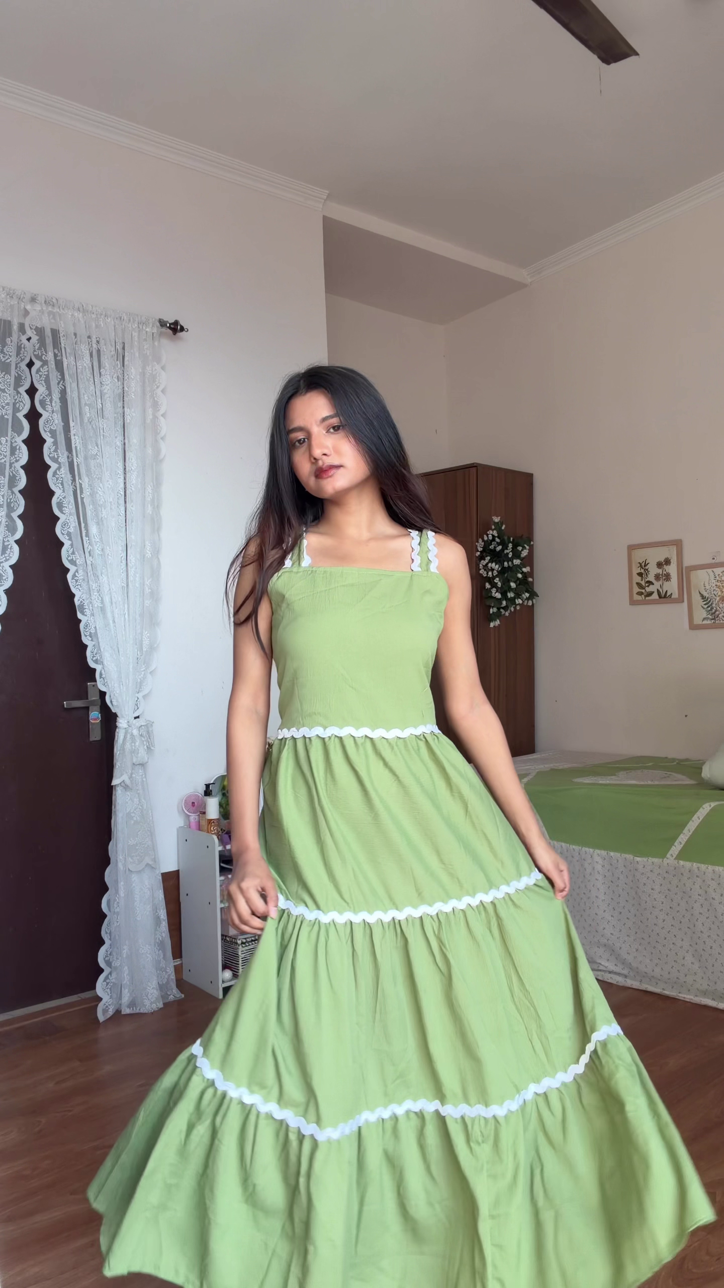Standing in a softly lit room, she exudes understated elegance in a sleek black dress paired with sheer white statement sleeves. The fitted silhouette highlights a timeless, minimalist aesthetic, while the voluminous sleeves add a touch of romantic charm. With natural makeup and effortless hair, the look blends modern sophistication with graceful simplicity.