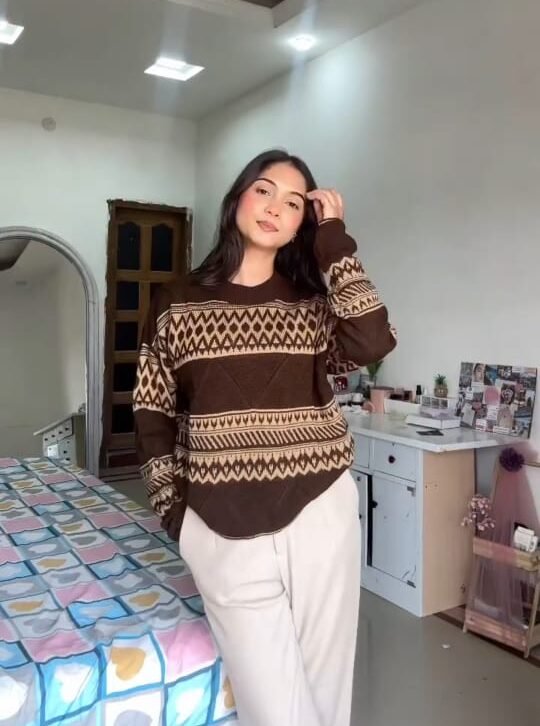The photo shows a woman standing in a softly lit bedroom, wearing a warm brown sweater with a detailed geometric pattern in lighter shades of beige and cream. The sweater has a relaxed, slightly oversized fit, paired effortlessly with loose, light-colored trousers that enhance the comfortable and casual vibe. She poses confidently with one hand touching her hair, giving the scene an easygoing, natural feel. In the background, the room features a neatly made bed with a colorful patterned blanket, a vanity table with cosmetics, and simple décor that adds to the cozy atmosphere.