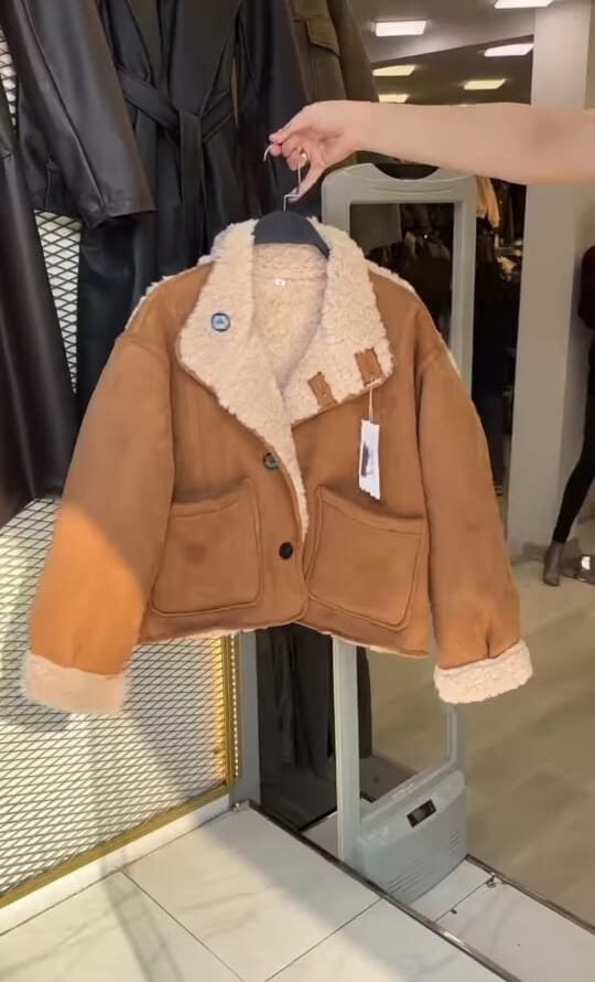 Cozy Shearling-Lined Suede Jacket on Display Description: