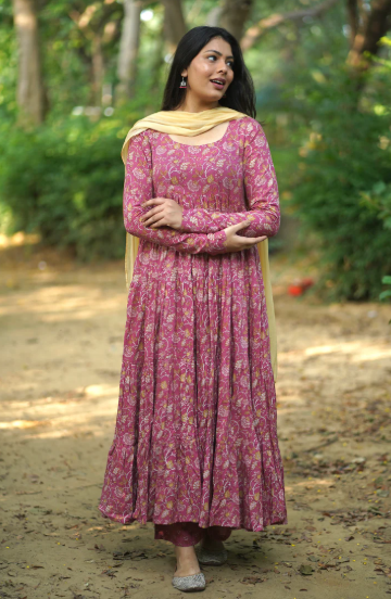 This dusty rose floral Anarkali set beautifully blends comfort with traditional charm. The full-length Anarkali features all-over floral prints and a round neckline with subtle detailing, giving it a graceful and feminine appeal. It’s paired with a contrasting yellow dupatta, adding a cheerful touch to the outfit. Perfect for casual outings, festive pujas, or daytime gatherings, this ensemble offers a light and elegant ethnic look. Style it with jhumkas and juttis for an effortlessly graceful appearance.