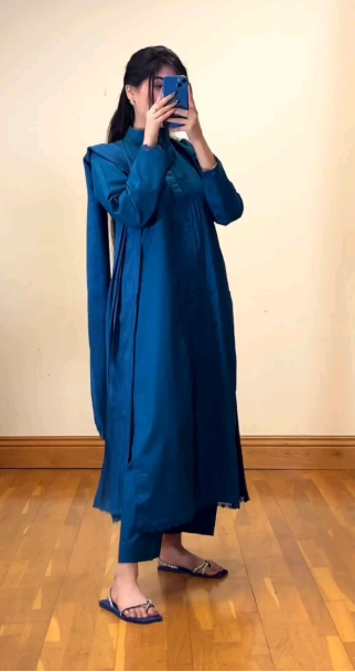 A minimalist teal long dress with a relaxed, flowing silhouette that blends comfort with understated style. Paired with simple sandals, the look feels airy and modern—perfect for casual outings, warm days, or an effortlessly chic everyday ensemble. The soft drape and clean lines highlight timeless elegance without trying too hard.