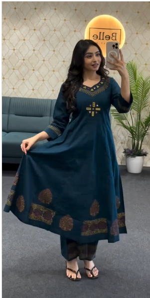 A stylish dark teal kurti featuring printed golden-brown motifs on the neckline, hemline, and sleeves. The A-line cut gives it a graceful flow, paired with matching trousers for a complete look. The outfit is both comfortable and chic, making it perfect for casual gatherings, office wear, or semi-formal occasions.