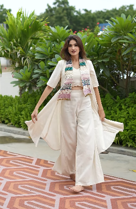- Description: This stylish outfit features a cream-colored tunic with a colorful embroidered jacket and matching wide-leg pants. The ensemble is complemented by a vibrant, patterned dupatta, creating a graceful and modern look suitable for casual or semi-formal occasions. The barefoot pose adds a relaxed, natural vibe, set against a backdrop of lush greenery and a patterned pathway.