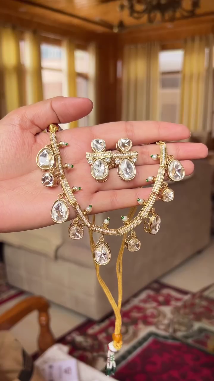 Designed for women who love traditional elegance with a refined modern touch, this Kundan-inspired necklace set blends heritage craftsmanship with contemporary wearability. If you are searching for bridal jewelry, ethnic necklace sets, Kundan-style accessories, or festive gold-tone jewelry online, this piece is a perfect match. Elevate your look and make a statement of grace, tradition, and sophistication with this exquisite necklace and earrings set.