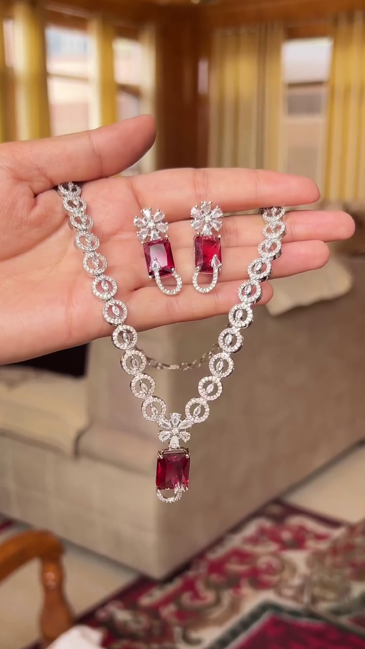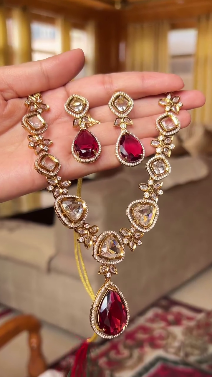 The matching earrings mirror the necklace’s design, featuring complementary stone arrangements that frame the face with elegance. Lightweight yet striking, they are designed to provide comfort without compromising on style. Together, the necklace and earrings create a cohesive and regal look that pairs effortlessly with lehengas, sarees, anarkalis, and other traditional outfits.