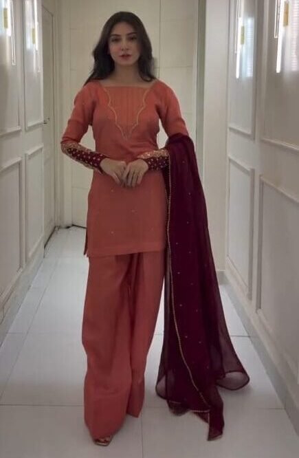 This graceful peach suit set features a straight-cut kurta paired with matching palazzo pants and a contrasting maroon dupatta. Designed with minimal elegance, it offers a sophisticated and comfortable fit, making it ideal for festive occasions, family gatherings, or casual traditional wear. The rich color contrast enhances its charm and timeless appeal.