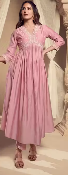 This graceful pink Anarkali kurta features a flowy silhouette with delicate embroidery around the neckline, adding a touch of elegance. Designed with long sleeves and a flared hemline, it combines comfort with traditional charm. Perfect for festive occasions, casual gatherings, or semi-formal events, this kurta brings out a soft and feminine appeal.