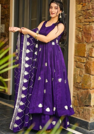 This stunning purple Anarkali suit features a sleeveless flared silhouette adorned with silver or white woven motifs throughout the fabric, giving it a regal and festive look. The set is paired with a matching dupatta that showcases an intricate border and geometric patterns, adding a graceful contrast. Perfect for festive occasions, weddings, or traditional celebrations, this outfit combines elegance with comfort and vibrant charm.