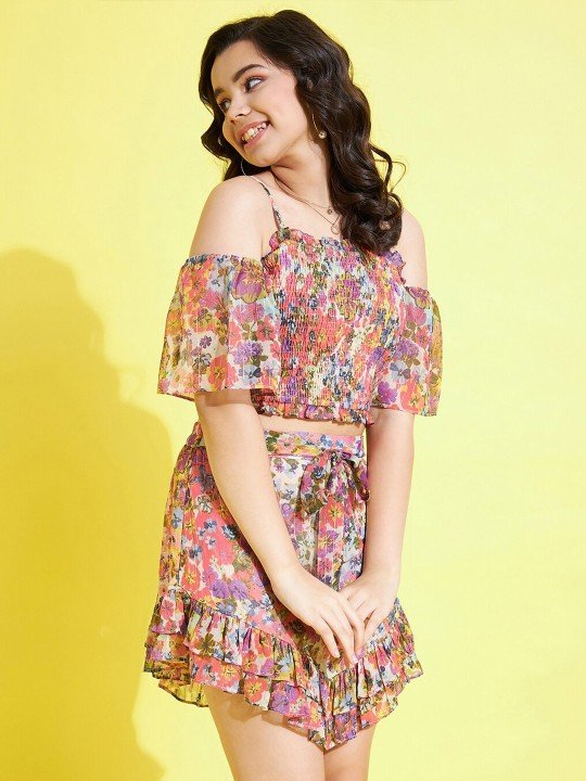 • Description: A vibrant two-piece outfit featuring an off-shoulder crop top with elasticated detailing and short sleeves, paired with a matching ruffled skirt with a tie waist. The set is adorned with a colorful floral print, perfect for a cheerful and stylish look.