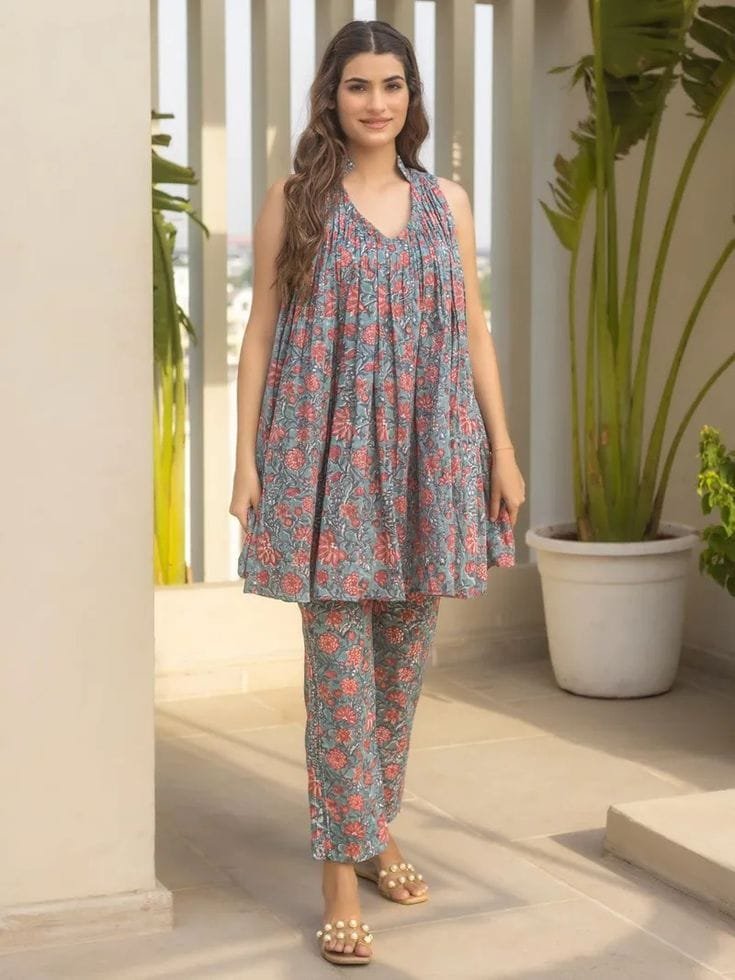 Floral Printed Cotton A-Line Kurta and Pant Set