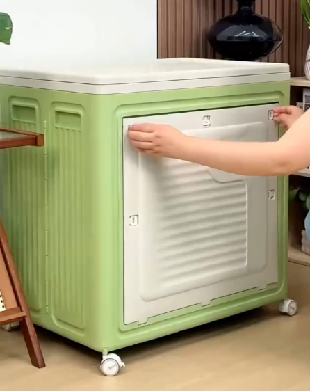 A versatile and space-saving foldable storage cabinet designed for modern homes. Featuring a sturdy frame with a secure front door, this unit keeps your belongings protected and dust-free. The spacious interior is ideal for storing clothes, household essentials, toys, or office supplies. Built with smooth-rolling caster wheels for easy mobility, it can be conveniently moved and positioned wherever needed. Its foldable design allows quick assembly and compact storage when not in use, making it perfect for apartments, dorm rooms, or multipurpose spaces.