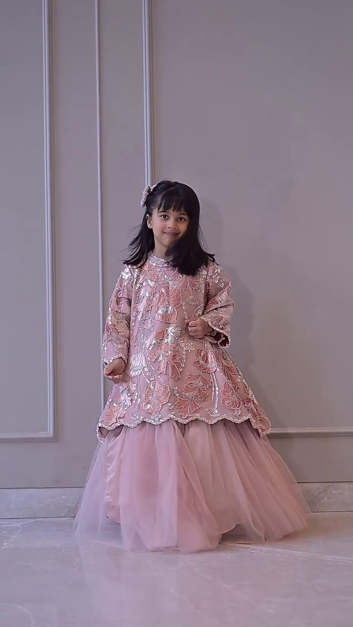 Crafted from premium-quality fabric, this dress offers a luxurious look while remaining gentle and comfortable on a child’s delicate skin. The soft blush pink shade adds a dreamy and graceful touch, perfect for creating a charming and elegant appearance. The upper bodice is adorned with detailed floral embroidery and sequin embellishments that add sparkle and sophistication, making the dress stand out in any celebration.