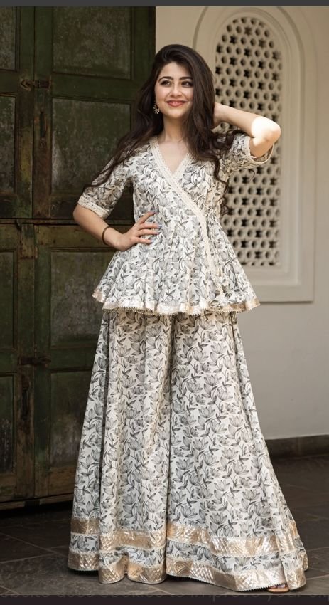 Ivory Floral Printed Peplum and Palazzo Set