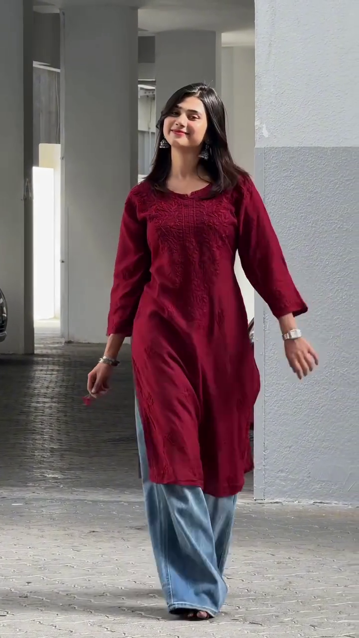 Stylish maroon embroidered kurti paired with wide-leg pants, perfect for casual outings, office wear, and everyday ethnic fashion. Comfortable and elegant women’s kurti set.