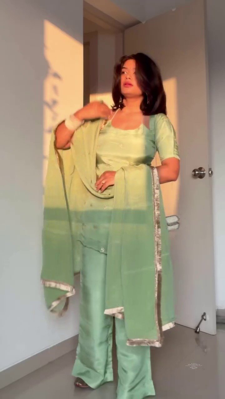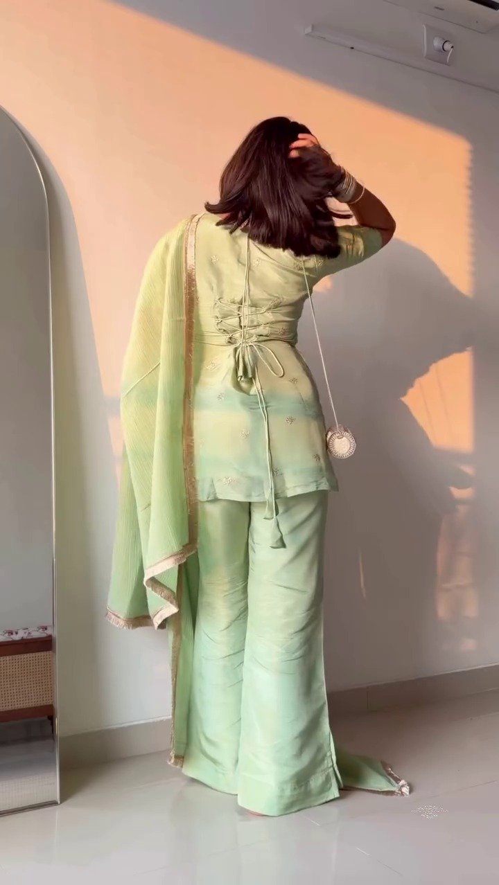 Refresh your ethnic wardrobe with this elegant mint green kurta pant set, crafted in a soft, silky fabric for a luxurious and graceful look. The minimalist kurta features a flattering neckline and subtle detailing, paired with straight-fit pants for a sleek silhouette. The matching sheer dupatta with delicate border work adds a touch of sophistication, making this outfit perfect for festive occasions, parties, and elegant day functions.