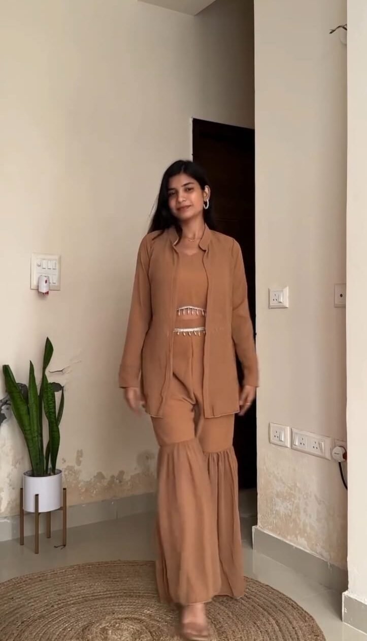 Elevate your everyday fashion with this mocha brown three-piece co-ord set featuring a sleeveless crop top adorned with delicate fringe details, matching flared pants, and a long open-front shrug. Crafted from lightweight crepe fabric, this outfit offers both comfort and style, making it perfect for brunch dates, casual outings, or holiday getaways. The earthy tone adds a touch of sophistication, while the flowy silhouette ensures all-day ease.