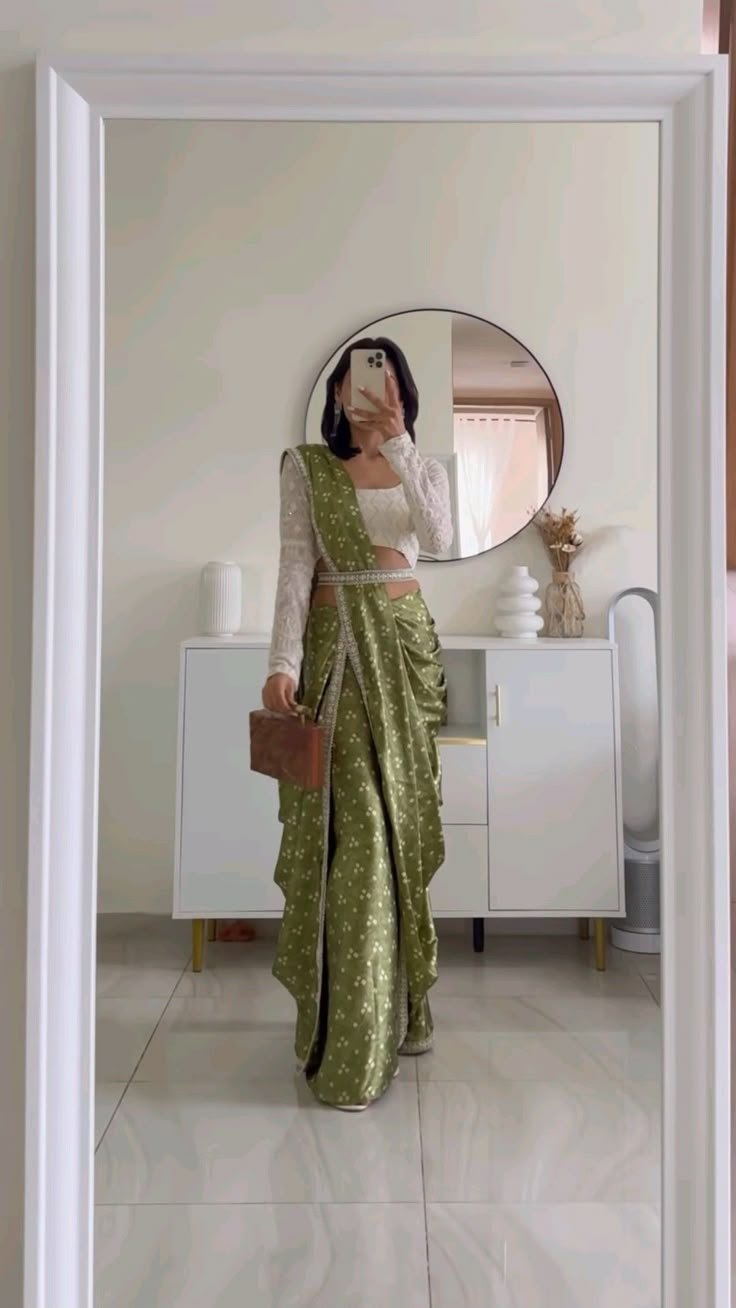 Whether it’s a festive celebration, a cocktail evening, or a high-profile wedding reception, this olive green saree ensemble guarantees a captivating look that speaks of poise, personality, and prestige.