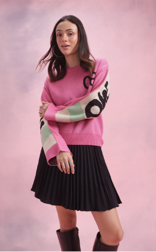 Brighten up your winter wardrobe with this Pink Graphic Colorblock Sweater. Crafted from soft knit fabric, this sweater features a fun contrast of colors on the sleeves with bold graphic detailing for a trendy, youthful vibe. The relaxed fit and ribbed edges ensure warmth and comfort, making it perfect for pairing with skirts, jeans, or trousers. Ideal for casual outings, brunches, or cozy winter days.