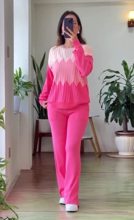 Stay effortlessly chic and cozy with this Pink Ombre Knitted Co-ord Set. Featuring a soft gradient from blush to hot pink, the full-sleeve top pairs beautifully with matching straight-fit pants for a flattering silhouette. Crafted in a soft, stretchable knit, this outfit blends comfort with trend — perfect for travel, brunches, or casual outings.