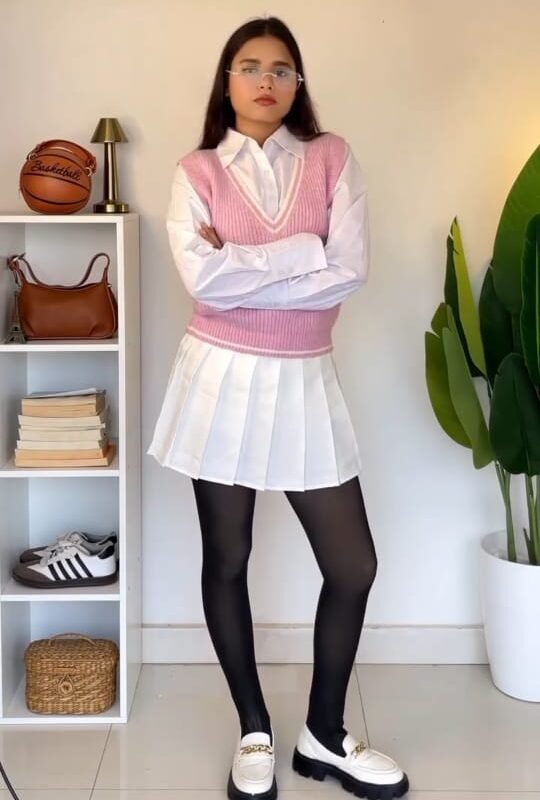 A soft pink sweater vest featuring a classic V-neckline with white varsity-style striping. Layered-friendly and lightweight, it adds a preppy, polished touch when paired over shirts or blouses.