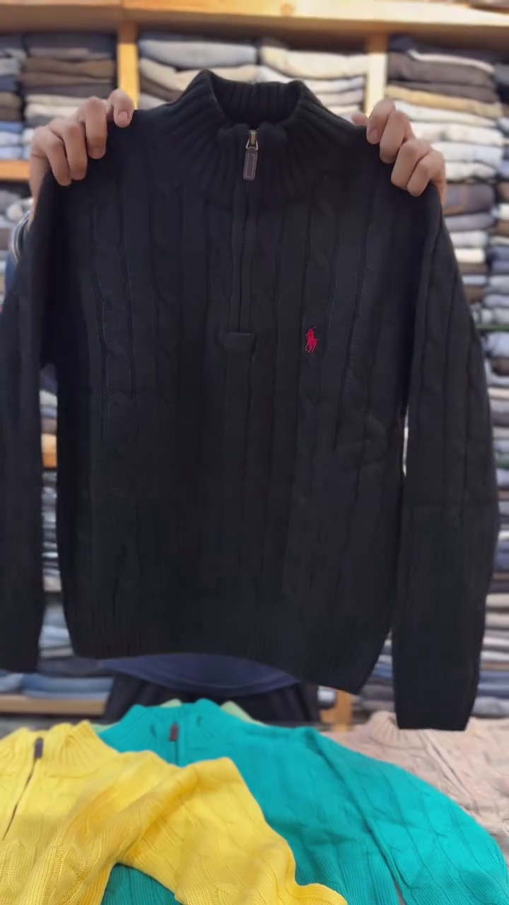 The neatly embroidered logo on the chest adds a touch of elegance and brand-inspired charm without overpowering the design. The sweater displayed also comes in a variety of attractive shades visible in the background—including beige, lemon yellow, olive, and classic black—giving you multiple choices to match your personal style or seasonal wardrobe palette. Whether you’re looking for a bold winter shade or a subtle neutral tone, this collection offers something for every preference.