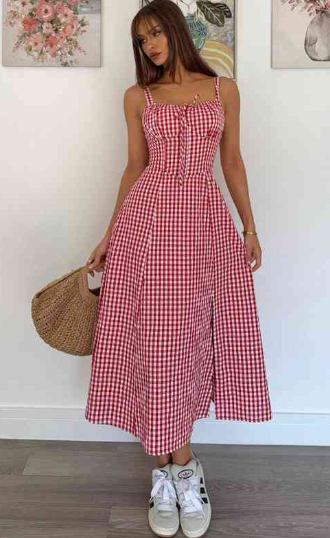 This charming red gingham midi dress features a fitted bodice with thin spaghetti straps and a flowy A-line silhouette. Designed with front button details, it combines comfort and casual elegance. Perfect for brunches, picnics, beach outings, or casual daywear, this dress pairs effortlessly with sneakers or sandals for a chic and playful look.