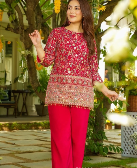 This vibrant red kurti features intricate floral prints with ethnic-inspired motifs, paired with matching straight pants for a stylish yet comfortable look. The kurti is designed with a round neckline and three-quarter sleeves, finished with a patterned border for added elegance. Perfect for casual outings, festive gatherings, or semi-formal occasions, this outfit blends tradition with modern style.