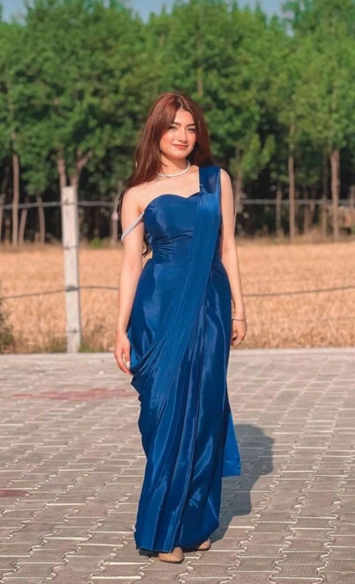 The bodice fits like couture — tailored with elegance to flatter the bust and waist — while the attached drape unfolds into a cascade of satin that mimics a saree’s pleats and pallu. The silhouette thus achieves the best of both worlds: the drama of traditional draping and the convenience of contemporary fashion.