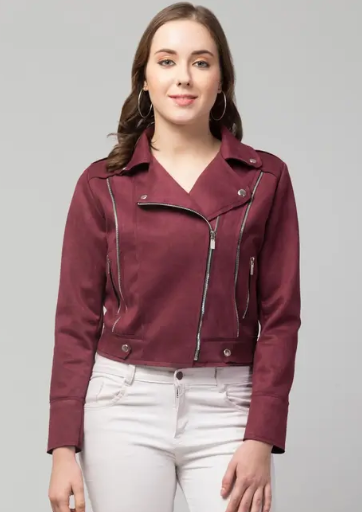 The image shows a woman wearing a chic burgundy moto jacket with a structured, modern silhouette. The jacket features multiple silver zippers and snap-button details, giving it a bold yet polished edge. She pairs it with white jeans, which brighten the outfit and create a striking contrast with the deep, rich color of the jacket. Her hair is styled simply, and she wears hoop earrings that add a subtle touch of elegance. The light gray background keeps the focus entirely on the outfit’s stylish, contemporary vibe.