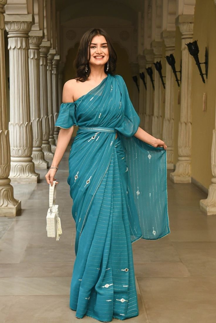 The beauty of the Teal Blue One-Shoulder Saree lies in its versatility. It transcends seasons, settings, and styles.