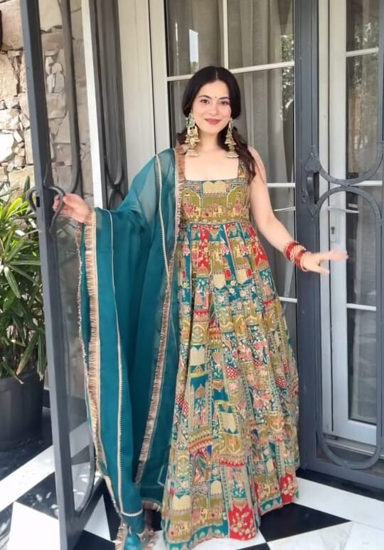The outfit is a vibrant multicolored floor-length anarkali adorned with traditional Indian motifs and intricate printed patterns, giving it a festive and regal touch. The square neckline adds a modern balance to the ethnic design. Paired with a contrasting teal dupatta bordered with golden lace detailing, the ensemble strikes the perfect blend of elegance and tradition. The styling with statement earrings and bangles further enhances its festive look, making it an ideal choice for weddings, sangeet, or festive celebrations.