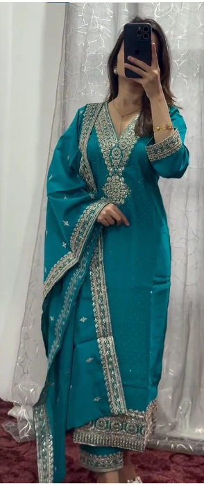 A graceful teal blue kaftan/abaya-style dress decorated with intricate golden embroidery along the neckline, cuffs, and borders. The front panel and dupatta-style extension are highlighted with delicate lace and motifs, adding richness to the attire. The outfit has an elegant and festive appeal, making it perfect for weddings, parties, and cultural celebrations.