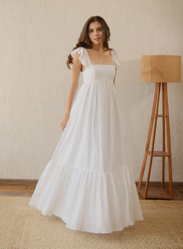 • Description: A elegant white maxi dress with a square neckline and multiple tiered layers, creating a voluminous, flowing skirt. The sleeveless design is complemented by subtle ruffled shoulder details, set against a minimalist indoor background with a wooden lamp.