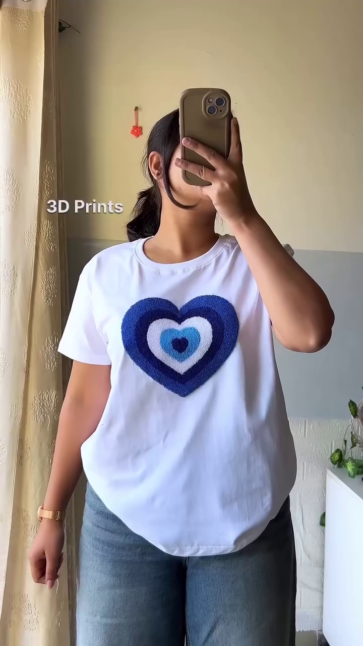 The highlight of this t-shirt is the eye-catching 3D heart print in shades of blue. The layered heart design adds depth and texture, creating a unique visual appeal that elevates the classic white tee. The contrasting blue tones pop beautifully against the white base, making the print a statement feature while still maintaining a clean, modern aesthetic. This design is perfect for those who enjoy subtle creativity in their everyday outfits.