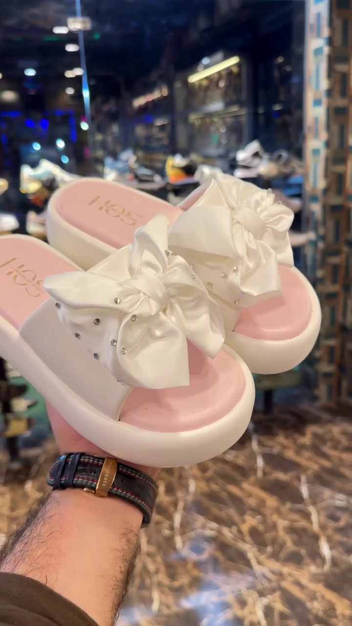 The white platform pairs beautifully with the pastel pink footbed and bow, enhancing the shoe’s elegant aesthetic.